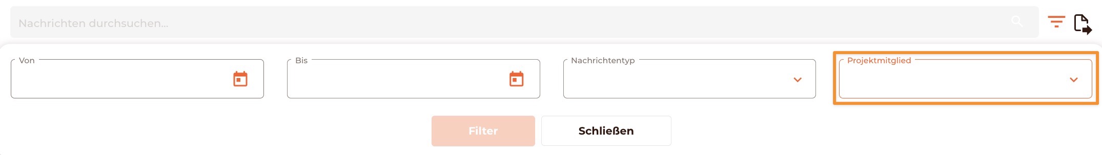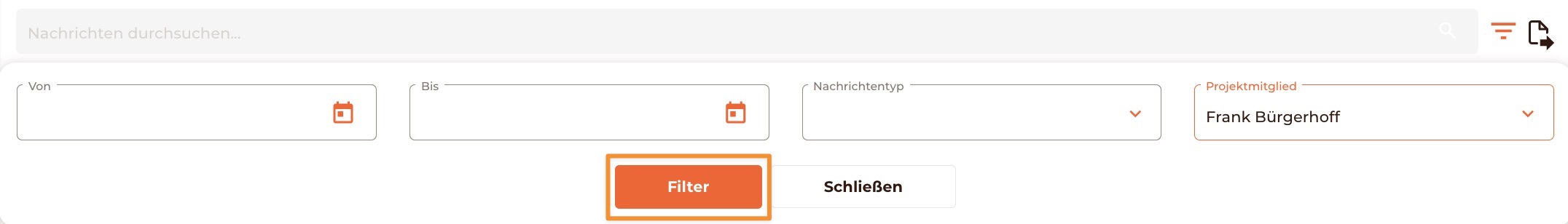 Neben der allgemeinen Suchfunktion steht Dir auch die präzise Filterung auf versendete Nachrichten eines Projektmitglieds zur Verfügung.