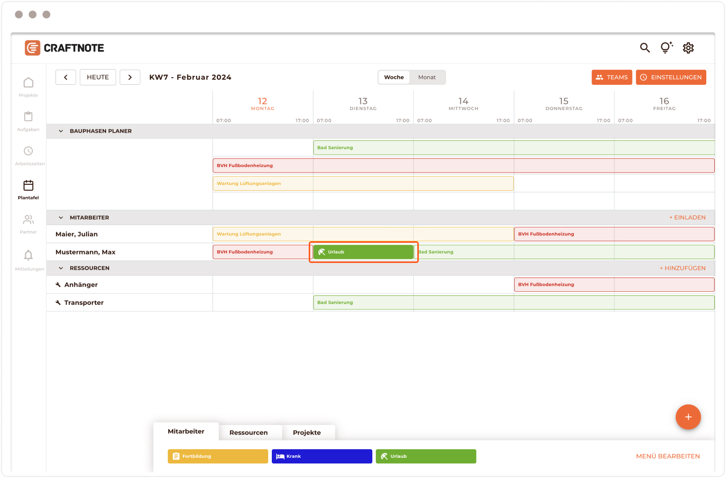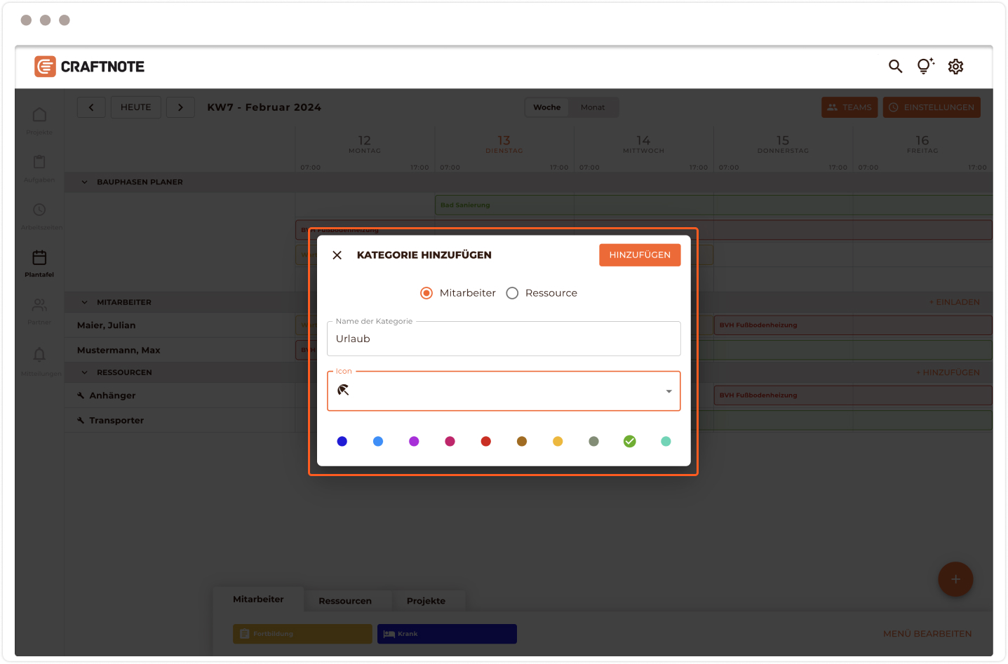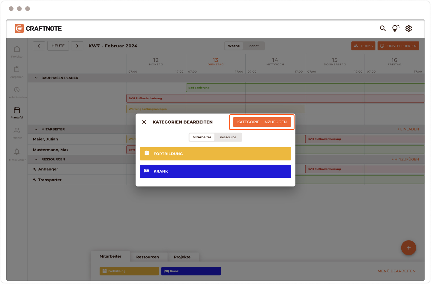 2) In der Plantafel siehst Du unten die Reiter “Mitarbeiter” und “Ressourcen”. Hier befinden sich die Kategorien.