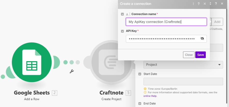 Damit Deine Make-Workflows auf Craftnote zugreifen dürfen, brauchst Du einen individuellen API-Schlüssel. Diesen Schlüssel musst Du einmalig mit Make verbinden.