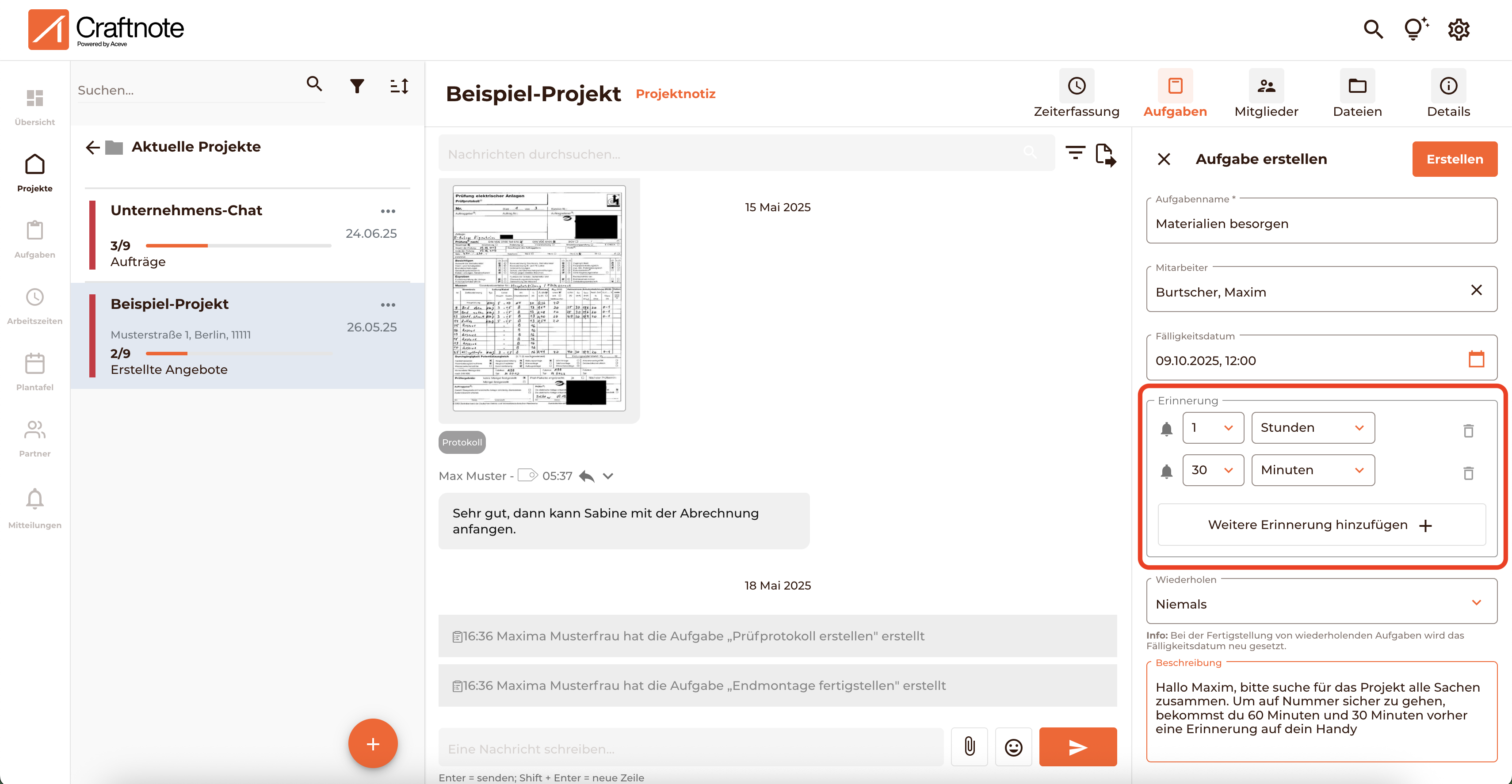 Über die Projektliste kannst Du Dir im jeweiligen Projekt Aufgaben anlegen. Ein Teil der Informationen, die Du dabei hinterlegen kannst, ist die Erinnerung zur Aufgabe. Die Erinnerung wird als Push-Benachrichtigung direkt an das Handy der Person gesendet, der die Aufgabe zugewiesen wurde. Sie orientiert sich am Fälligkeitsdatum der Aufgabe und sorgt dafür, dass der Mitarbeitende rechtzeitig daran erinnert wird. Du kannst z. B. einstellen, dass die Erinnerung eine Stunde vor dem Termin erscheint. So stellst Du sicher, dass keine Aufgabe untergeht – auch wenn es im Projekt mal stressig wird.