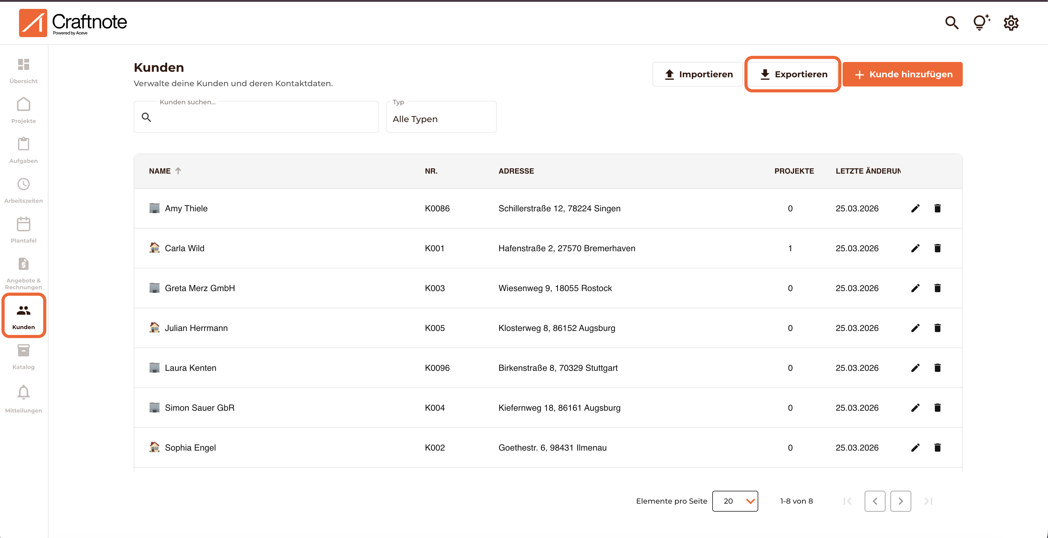 In diesem Artikel erfährst Du, wie Du Deine Kundendaten aus Craftnote als CSV-Datei exportierst. Der Export enthält alle wichtigen Kundeninformationen wie Name, Adresse, Kontaktdaten und Ansprechpartner.