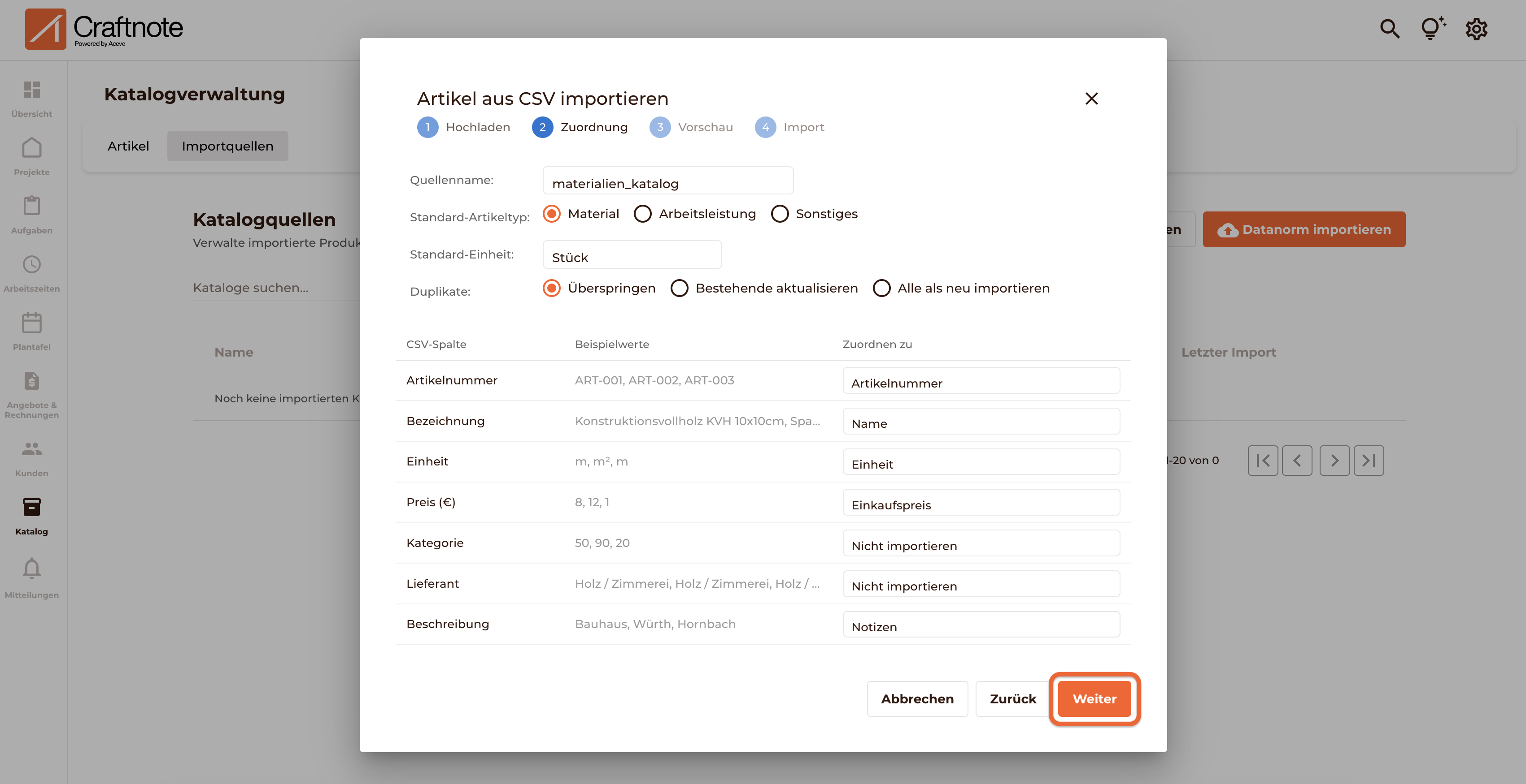 - Craftnote versucht, die Spalten automatisch anhand der Überschriften zuzuordnen (z. B. „Artikelnr.", „Bezeichnung")