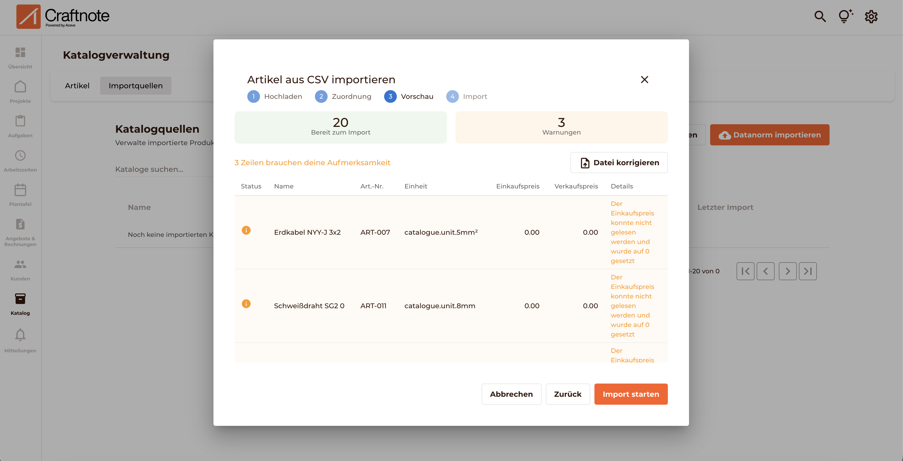 - Korrigiere die Datei und versuche es erneut oder klicke auf Import starten und passe die fehlerhaften Artikel später direkt in Craftnote an