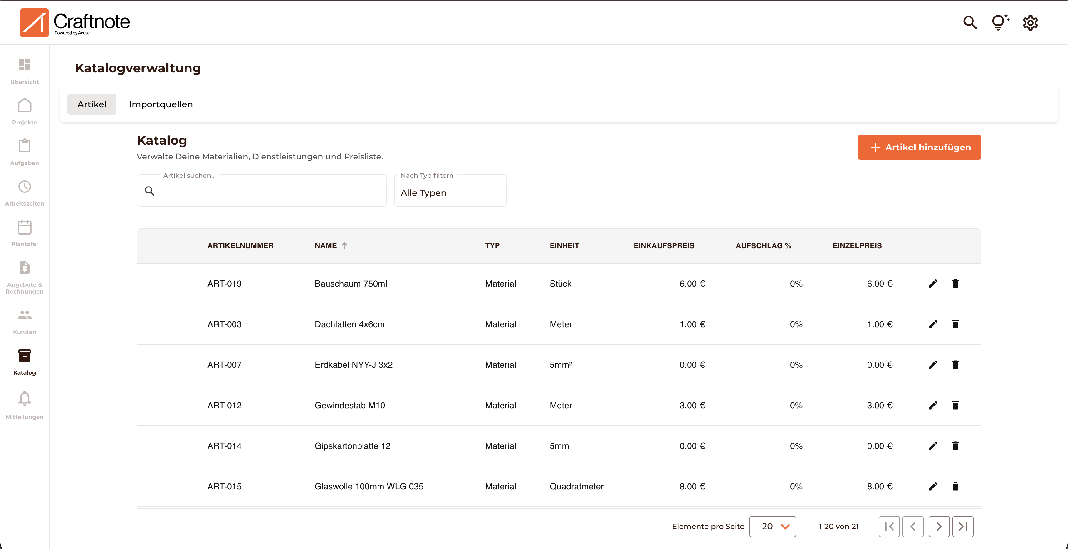 - Verfügbare Felder: Artikelnummer, Name, Typ, Einheit, Einkaufspreis (EK), Aufschlag (%), Verkaufspreis (VK) und Notizen