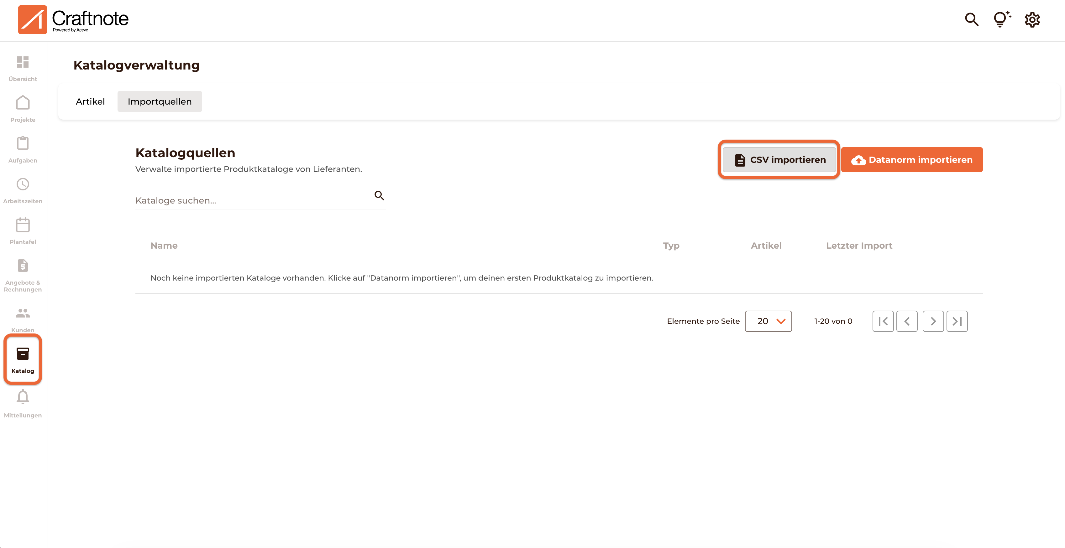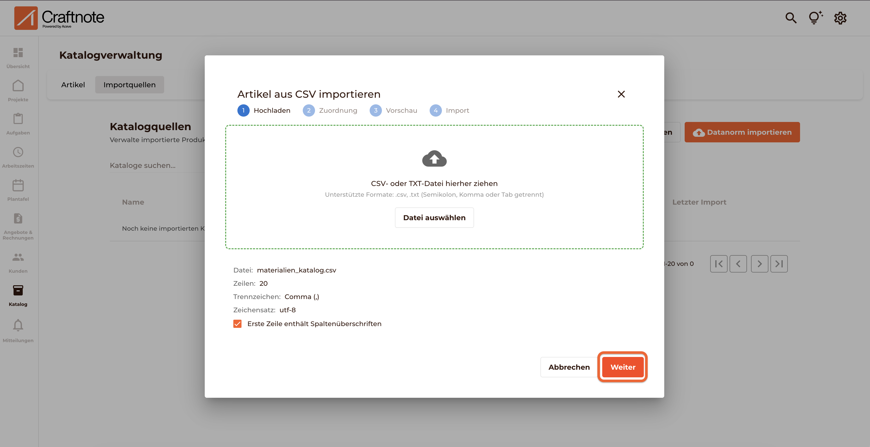In diesem Artikel erfährst Du, wie Du Artikel per CSV-Datei in den Materialkatalog von Craftnote importierst. Ein geführter Assistent hilft Dir beim Hochladen, Zuordnen der Spalten und Prüfen der Daten vor dem Import.