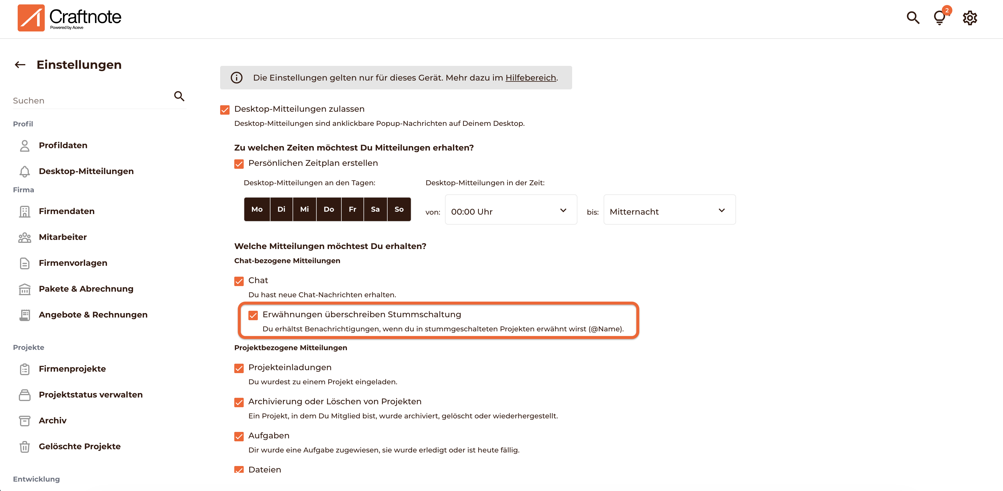 - Damit Du Erwähnungen auch dann benachrichtigt bekommst, wenn Du den Projekt-Chat stummgeschaltet hast, kannst Du die Option für Erwähnungs-Benachrichtigungen aktivieren