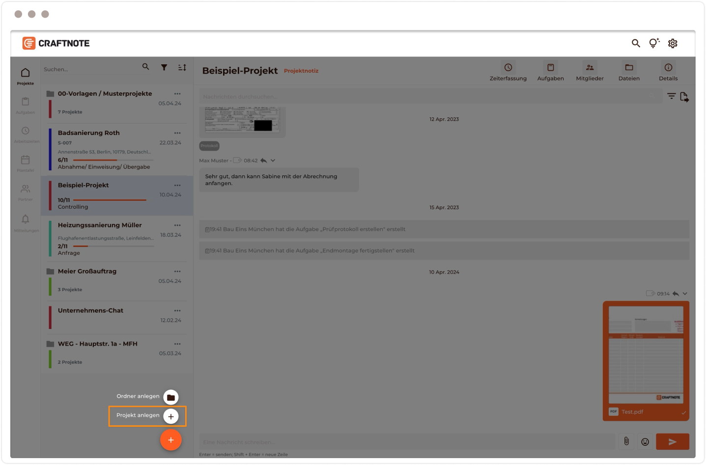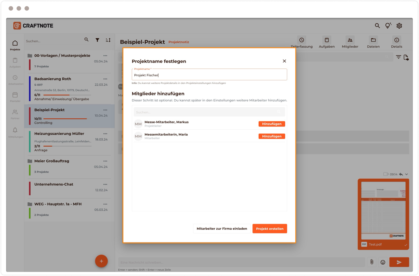 4) In dem daraufhin erscheinenden Fenster gibst Du den Projektnamen ein und bestätigst Deine Eingabe mit einem Klick auf den orangefarbenen Button “Projekt erstellen”. Mitarbeiter, die bereits zu Deiner Firma eingeladen wurden, können direkt als Projektmitglieder hinzugefügt werden, indem Du auf den Button “Hinzufügen” klickst.