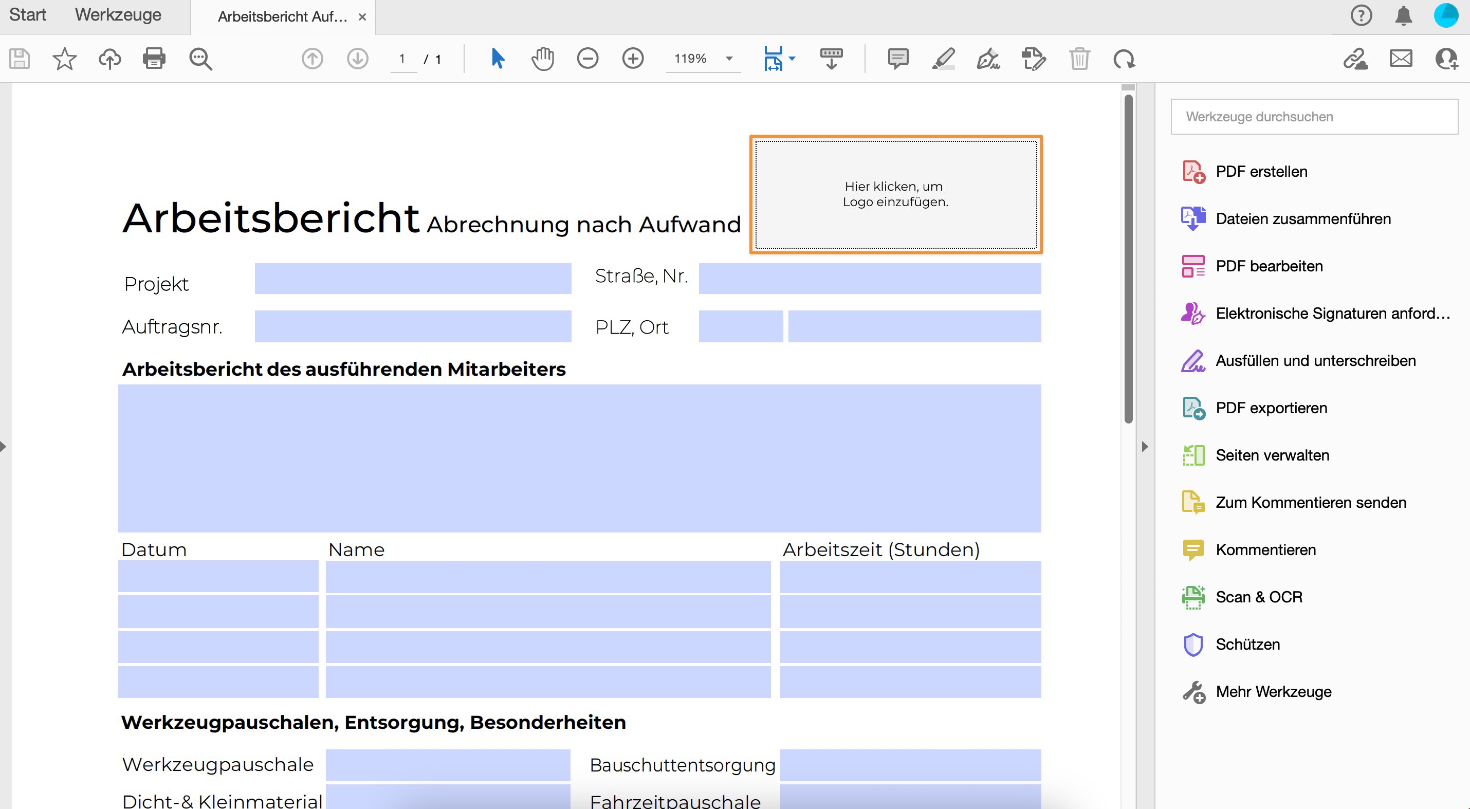 1) Öffne die zu bearbeitende PDF-Firmenvorlage über das Bearbeitungsprogramm. Klicke anschließend oben rechts auf "Hier klicken, um Logo einzufügen.".