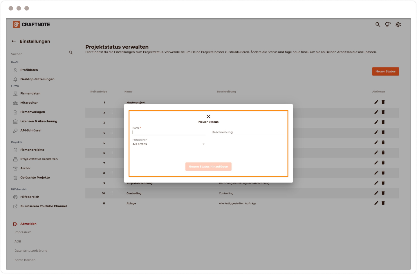 Um einen neuen Status hinzuzufügen, klicke auf den orangefarbenen Button "Neuer Status".