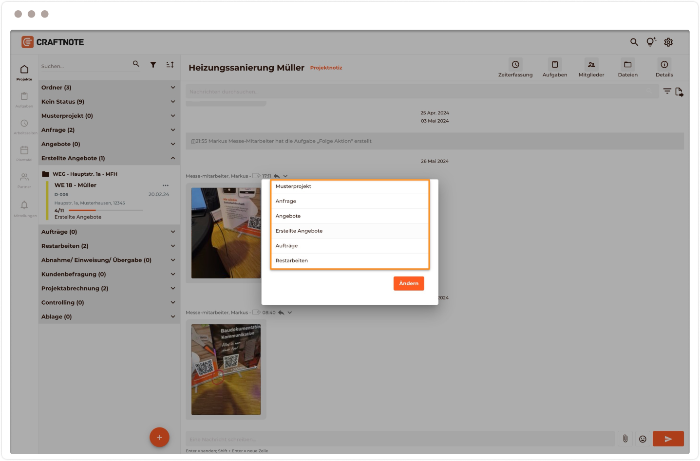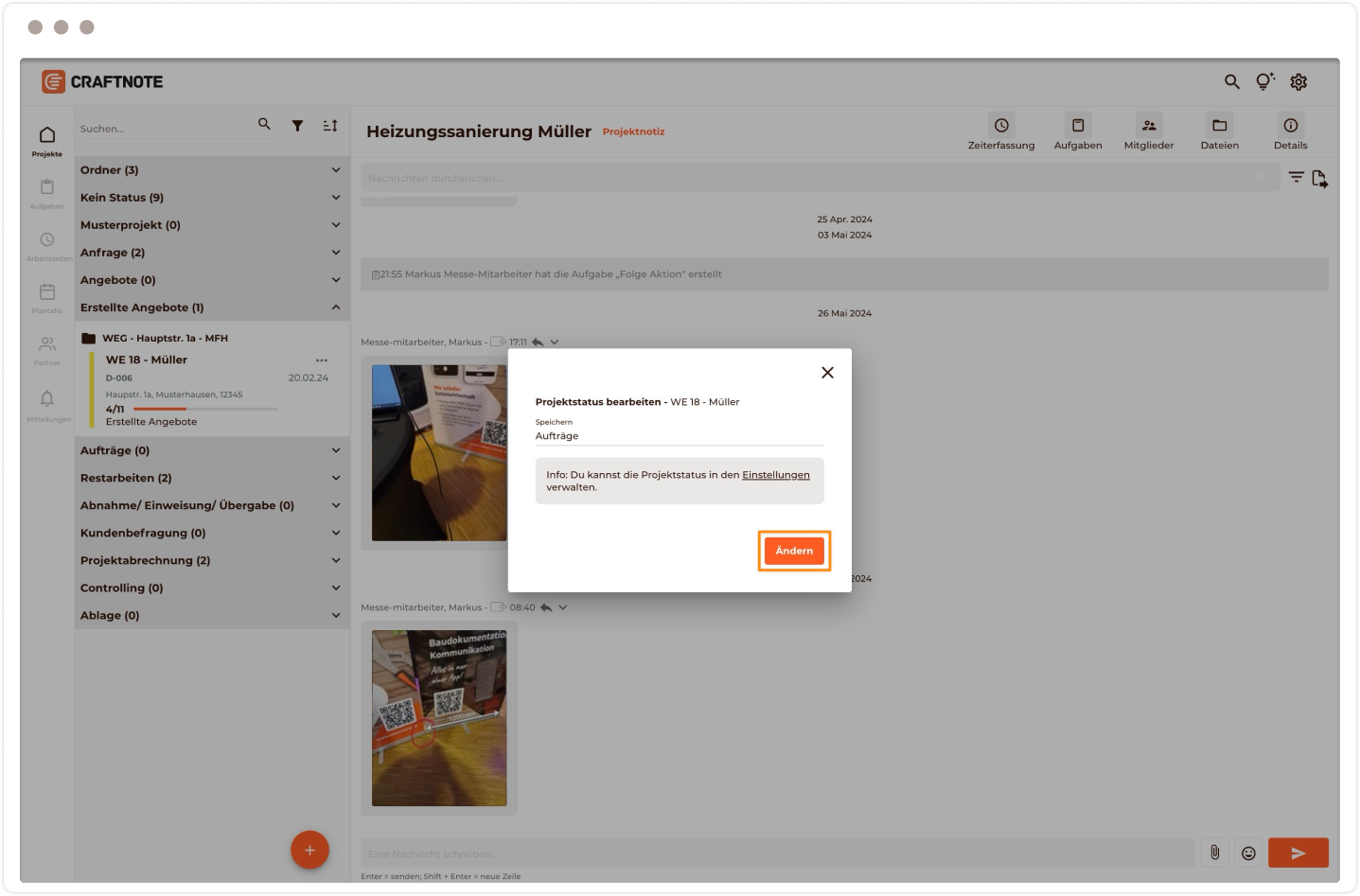 Nutzer mit der in Craftnote zugewiesenen Rolle ‘Inhaber’ oder ‘Projektleiter’ können einen Status hinzufügen, löschen oder bearbeiten.