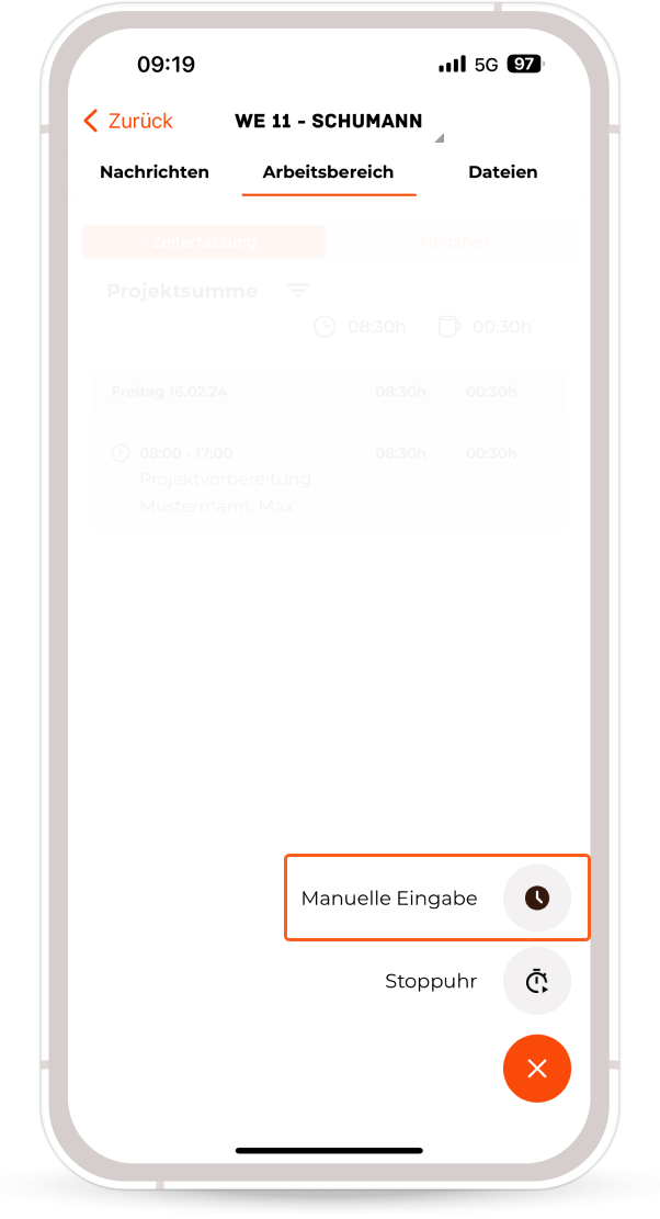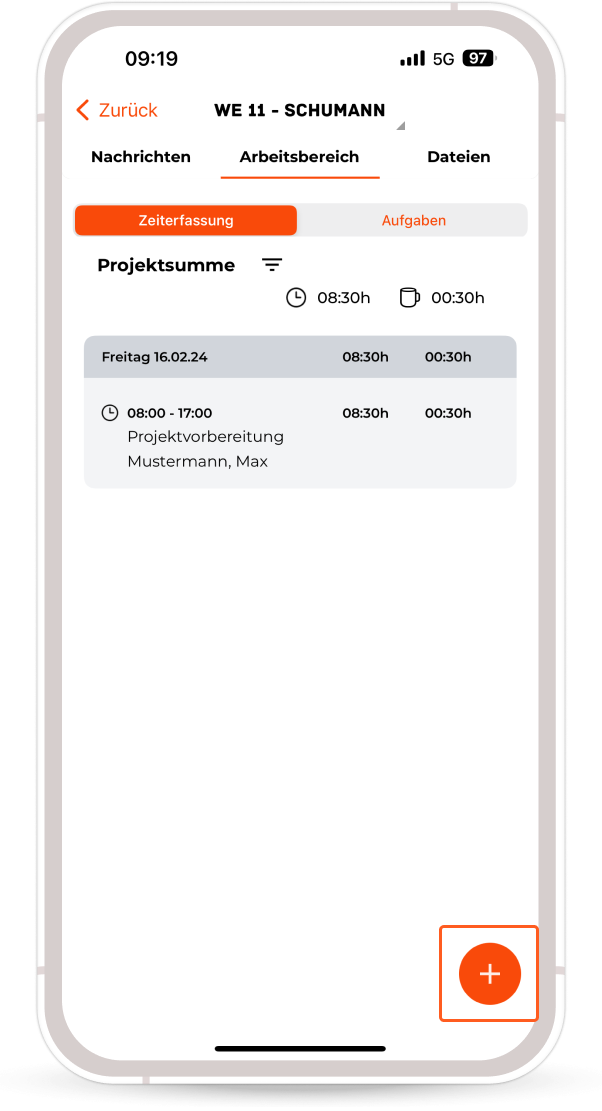 3) Nun siehst Du die bisher hinterlegten Zeiteinträge von allen Projektmitgliedern. Um einen neuen Eintrag zu erstellen, klicke unten rechts auf das orangefarbene Pluszeichen.