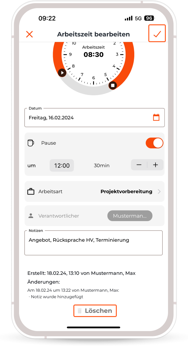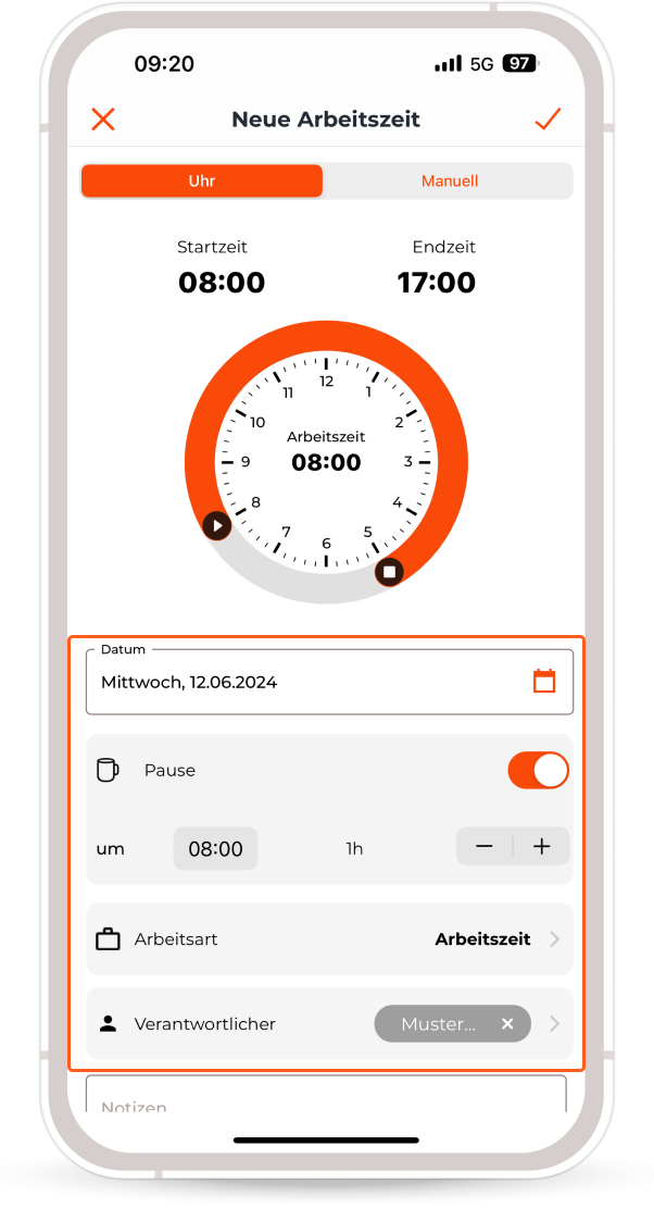 Gebe hier genau wie zuvor Deine Startzeit, Endzeit, Pausenzeit, Arbeitsart und Verantwortlichen ein.