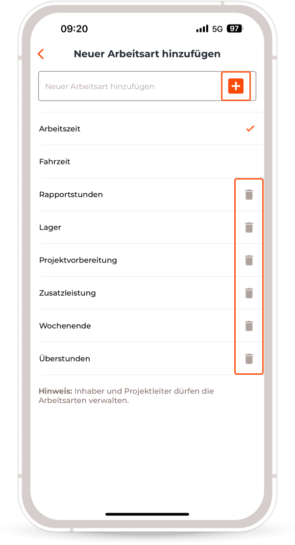 Nun kannst Du in das obere Feld eine neue Arbeitsart eintragen und sie über das Pluszeichen-Symbol zu Deiner Liste hinzufügen. Mit einem Klick auf das Papierkorb-Symbol kannst Du ganz einfach die bereits hinzugefügten Arbeitsarten löschen.