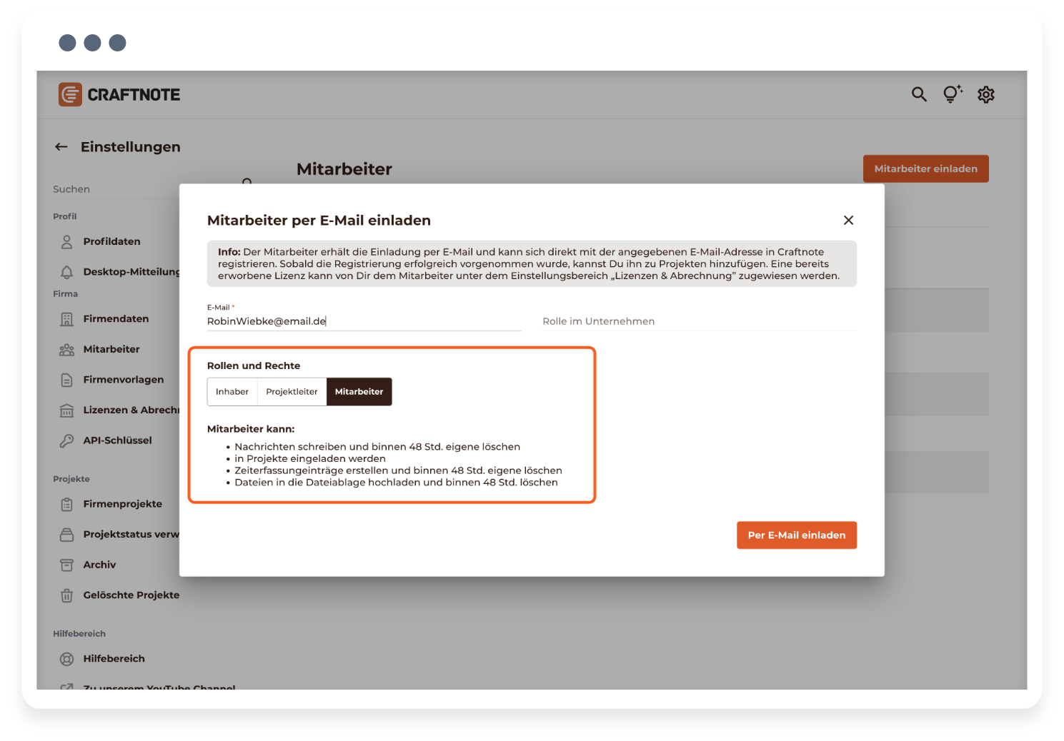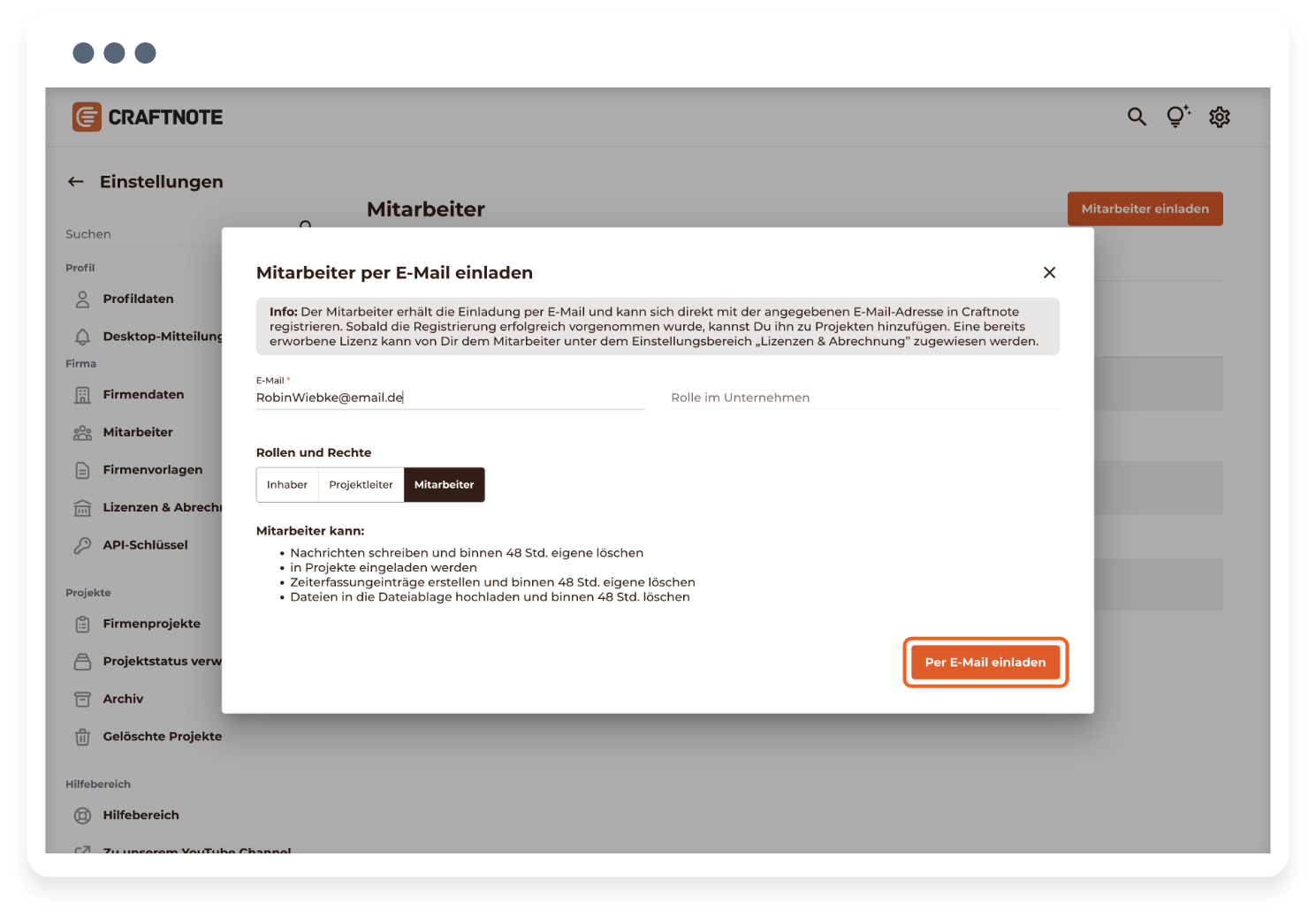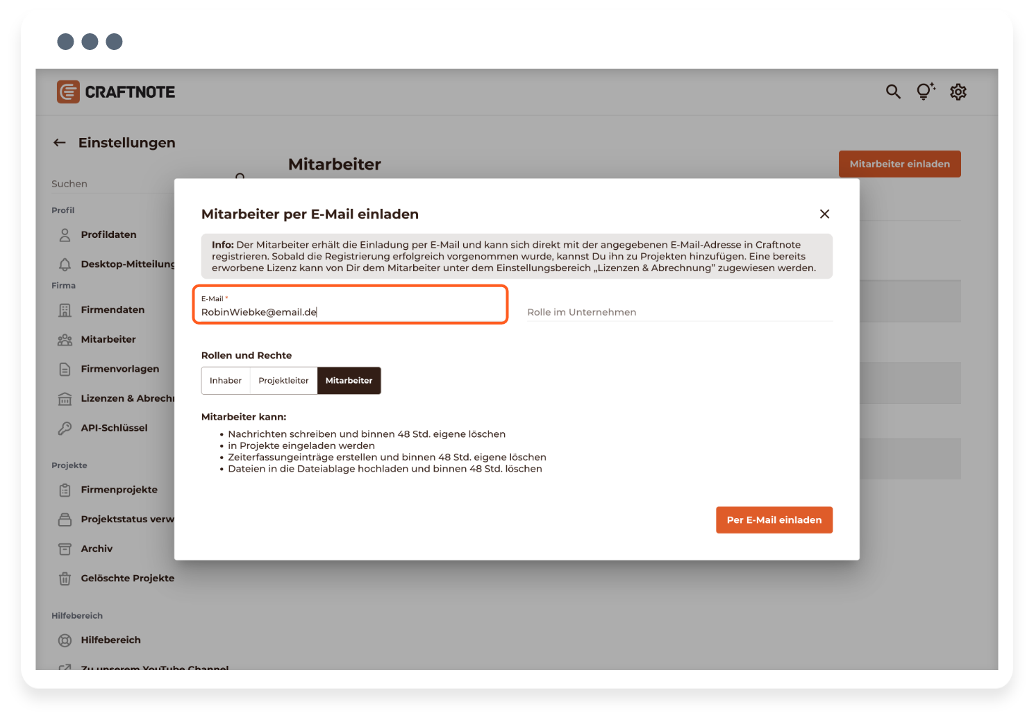- Du kannst ausschließlich als Nutzer mit der in Craftnote zugewiesenen Rolle „Inhaber" einen Mitarbeiter in Deine Craftnote-Firma einladen.