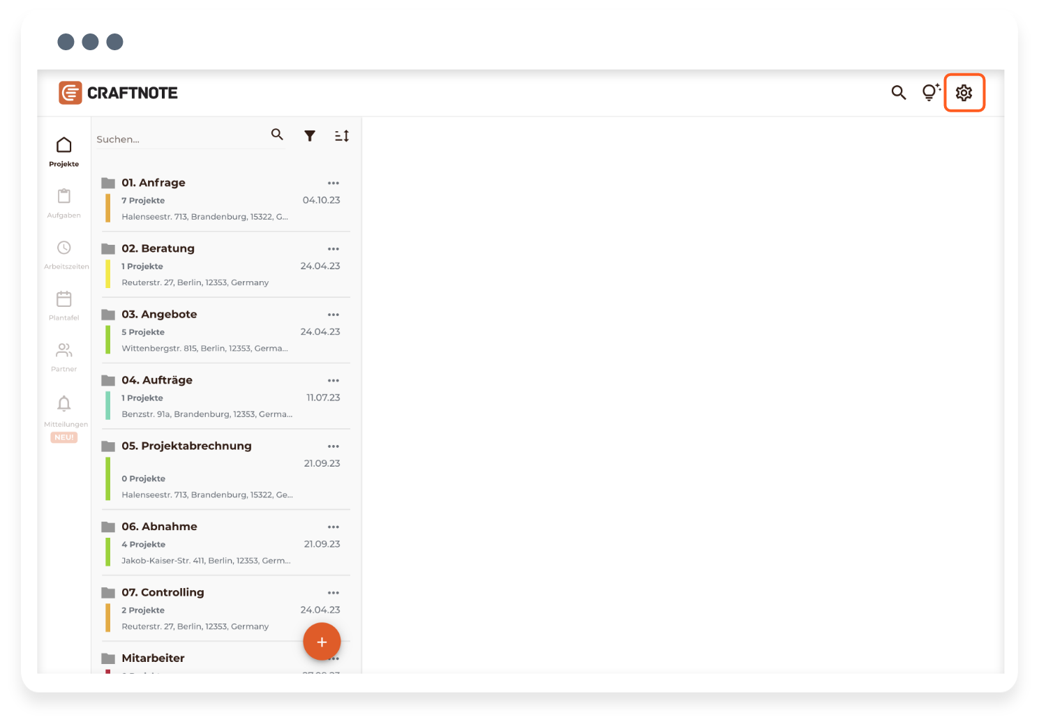 1) Begib Dich bitte als Nutzer mit der in Craftnote zugewiesenen Rolle „Inhaber" in die Web-App und klicke rechts oben auf das Zahnrad-Symbol. Du gelangst hiermit in die "Einstellungen" der Web-App.