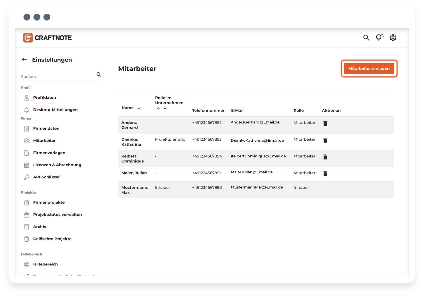 * In beiden Fällen (Schritt 6 & 7) muss die E-Mail nicht vom Eingeladenen bestätigt werden, um erfolgreich zur Craftnote-Firma hinzugefügt zu werden.