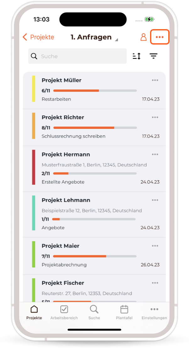 1) Öffne die mobile App und wähle den Projektordner bzw. das betreffende Projekt aus und klicke auf die 3 Punkte (°°° oben rechts). Hiermit gelangst Du in den Bereich "Ordner-/ bzw. Projektdetails".