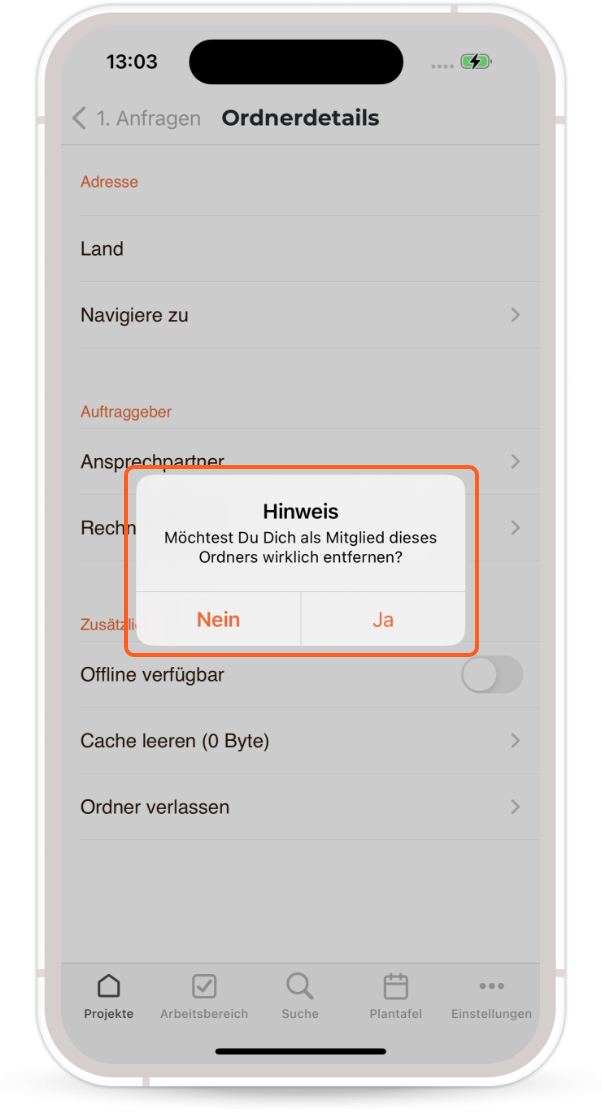 3) Bestätige die hierauf erscheinende Sicherheitsabfrage mit einem Klick auf den Button "Ja" und Du bist nicht mehr Mitglied des Projektordners bzw. des Projektes.