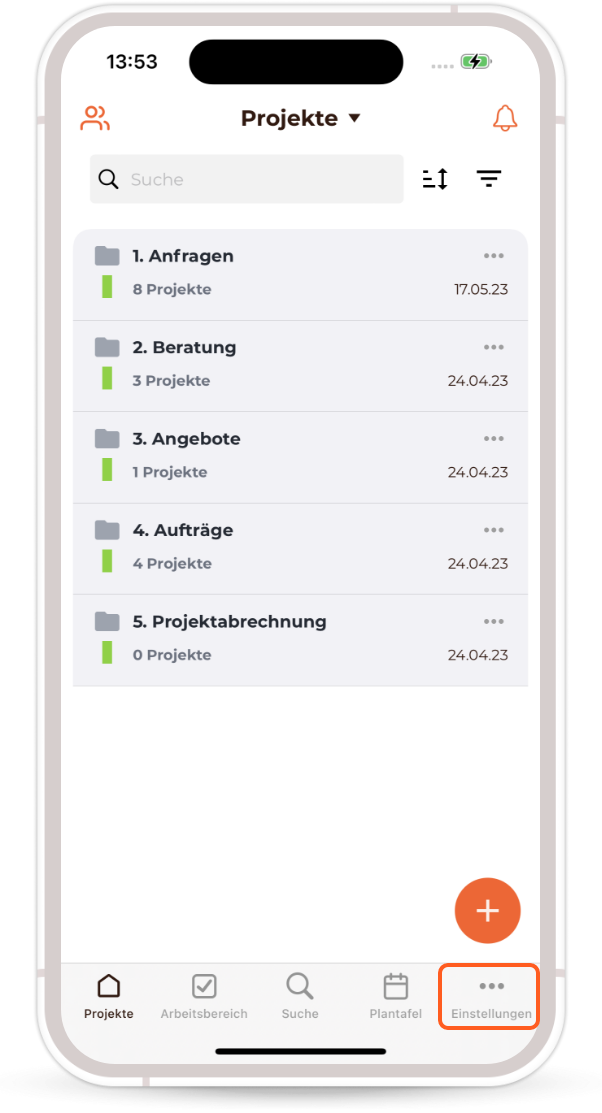 1) Öffne die mobile Craftnote-App und klicke unten rechts auf "Einstellungen".