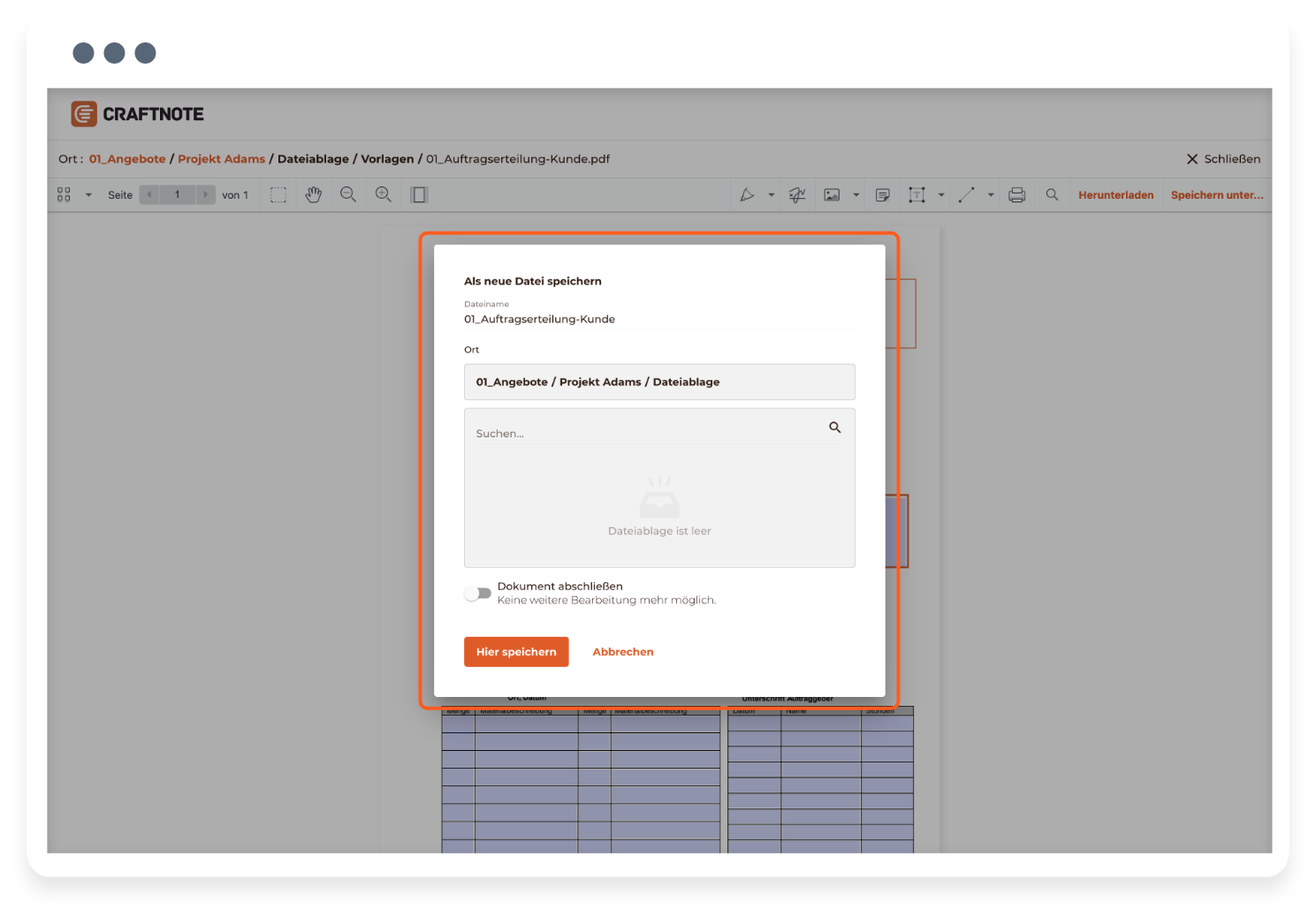 - Darf das gespeicherte PDF-Formular nicht mehr nachträglich bearbeitbar sein, muss der Schieberegler "Dokument abschließen" betätigt werden.