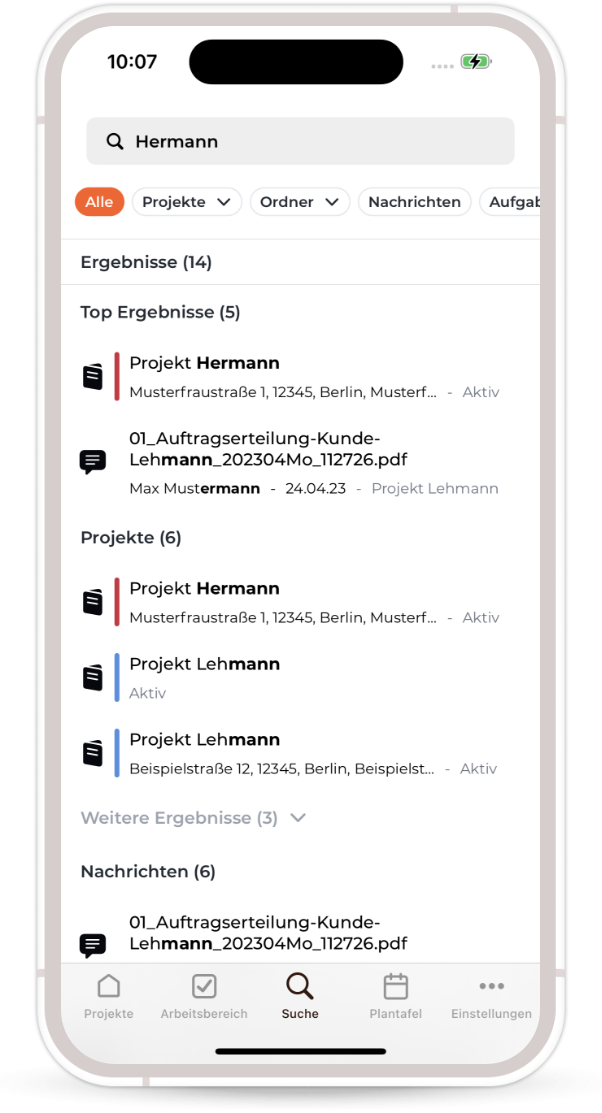 - Suchergebnisse werden nur für Projekte / Projektordner zu denen Du selbst als Projektmitglied hinterlegt bist, angezeigt.