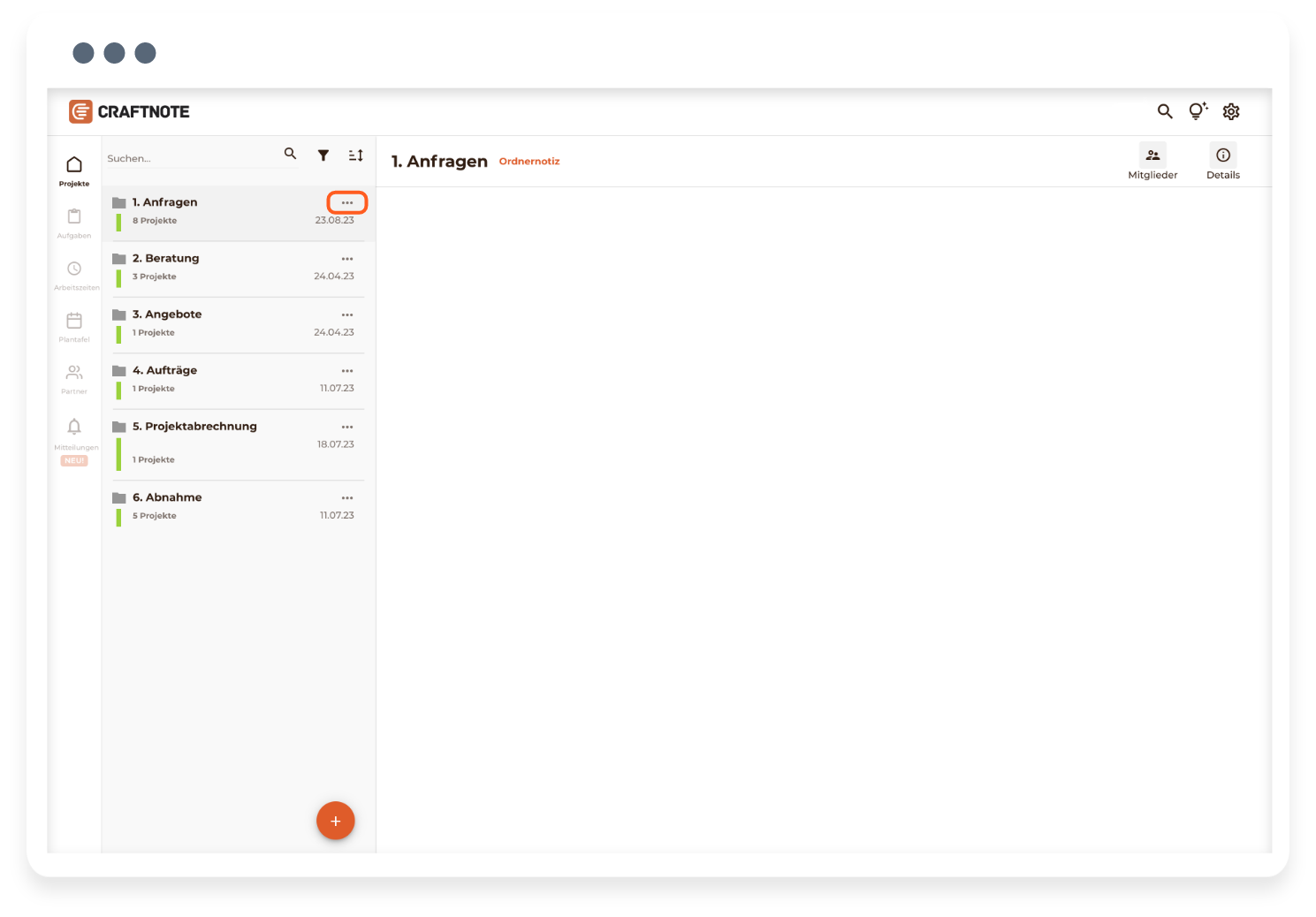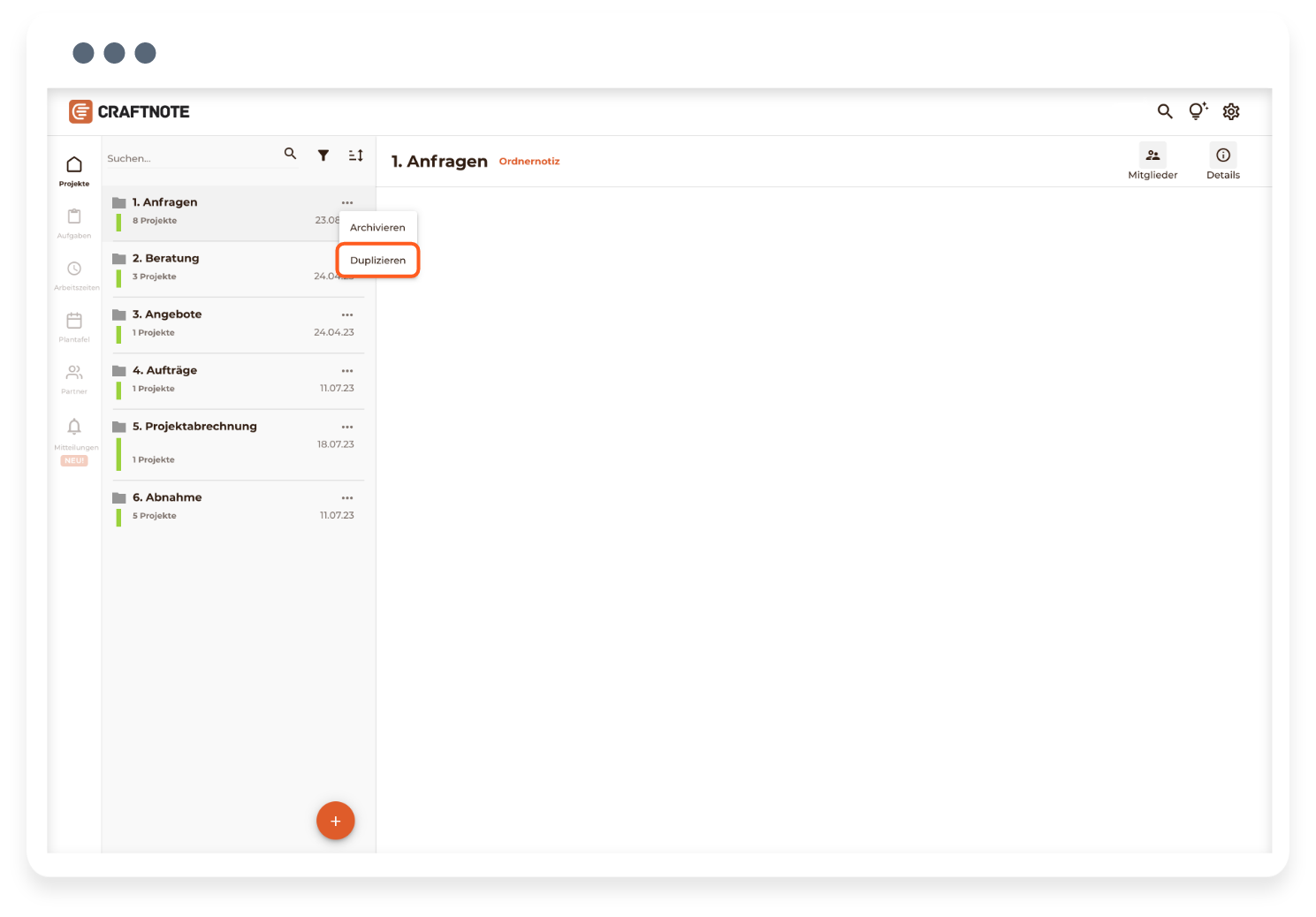 Using the "Duplicate" function, existing folders and all projects stored in them can be easily copied. Internal and external project members can be transferred to the duplicate.