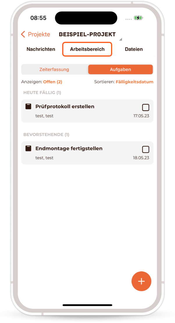 In the ‘Workspace’ you will find the two categories ‘Time recording’ & ‘Tasks’.