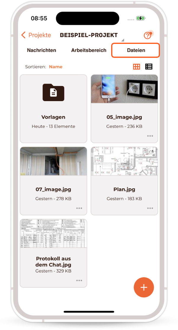 You can view, download and manage the documents and images stored in the ‘Files’ section (file storage).