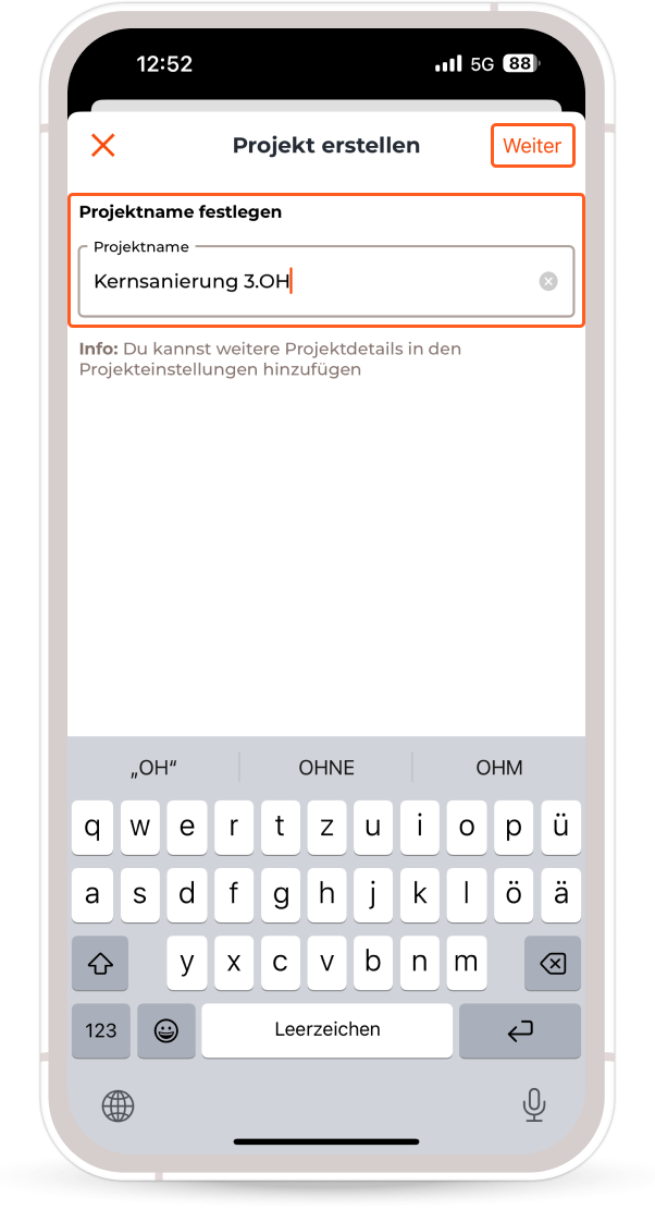 3) Now enter the desired project name and confirm the entry by clicking on "Next" in the top right-hand corner.