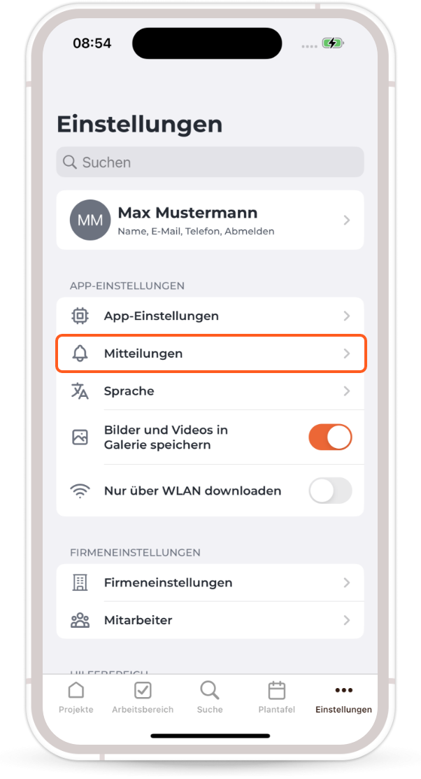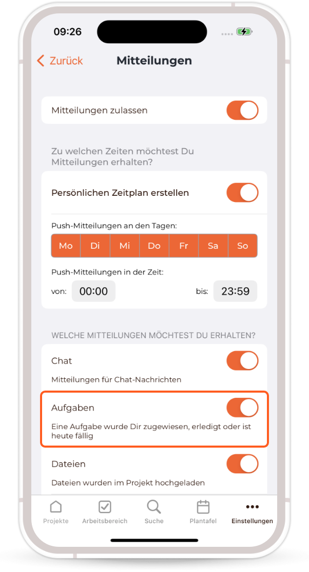 Please check in the mobile Craftnote app under the ‘Messages’ settings area whether the slider for ‘Tasks’ is already displayed in orange or still grey (deactivated).