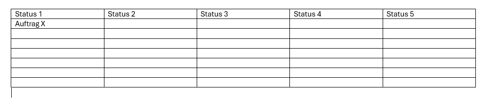 Eine Übersichtsfunktion, wo sich welche Aufträge gerade befinden. Da man den Status der einzelnen Aufträge ändern kann, wäre es hier auch super, eine Tabelle zu haben, wo von rechts nach links sortiert wird (Reihenfolge der Staus), um einen Überblick zu haben, wo die Aufträge gerade sind.